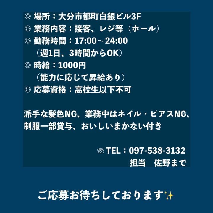 業務内容/勤務時間/待遇...などについては、写真の2枚目をご覧ください!!